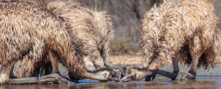 Emus drinking from shallow pool Mungo National Park Catherine Douglas