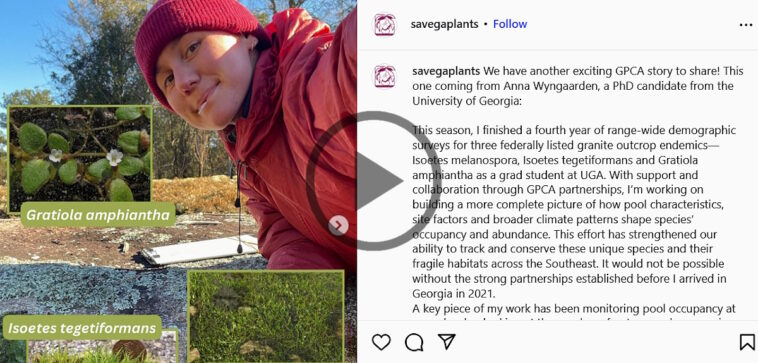 Top: GPCA post highlights UGA’s Anna Wyngaarden work with federally listed granite-outcrop plants.